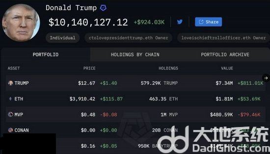 美国前总统特朗普(Donald Trump)在X上拥有8,720万名粉丝,根据Arkham Intelligence数据,他的加密货币净资产在昨日一度超过1,000万美元,主因是其特朗普Meme币MAGA(代码为TRUMP)的大幅上涨,根据CoinMarketCap的资料,TRUMP在五月受到特朗普支持加密言论的激励,由4美元一路上涨,目前价格已来到11.24美元。