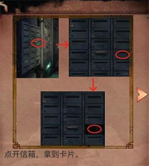 首先需要找右边保安室的保安,他告诉我们钥匙在邮箱里,先去左边信箱最右边没上锁的柜子拿到透明塑料卡片。