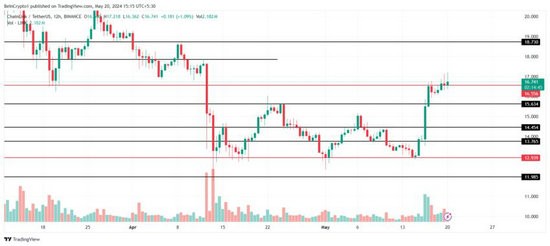 Chainlink 的交易价格为 16.8 美元,突破了多个阻力位,突破了 16.5 美元的阻力位。接近 17.0 美元时,山寨币出现大幅上涨。然而,这种将 LINK 推至月度高点的推动也可能导致下跌。