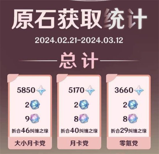 月卡党:5170原石2相遇8纠缠(折合40纠缠2相遇)