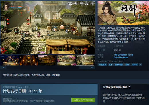 国产像素武侠RPG游戏《代号:问剑》将于2023年内发售。