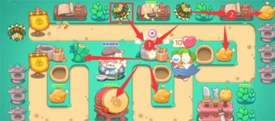 4、在下图的区域放置炮塔之后就可以安心的清鸡腿了,每开一个鸡腿会给一个回旋镖,如果不想带到下一关可以在最后卖掉。