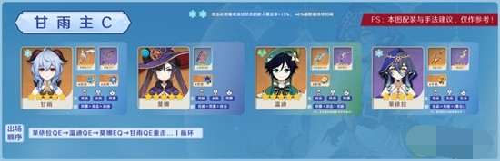同上个阵容类似,区别在于远程作战与贴脸作战。同样的续航位置不管是莱依拉或是迪奥娜都行,若莱依拉已解锁4命可优先选择莱依拉。