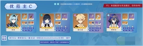 该阵容在循环上的表现是基本无压力的,提供单个角色充能的雷主(雷元素旅行者)加上莱依拉的持续后台产球,优菈基本不会担心自身的回能问题。雷主的充能越高越好,在该阵容的定位就是提供回能。