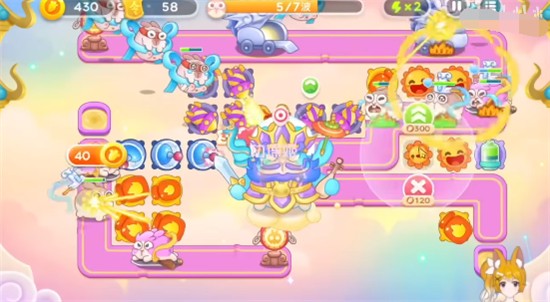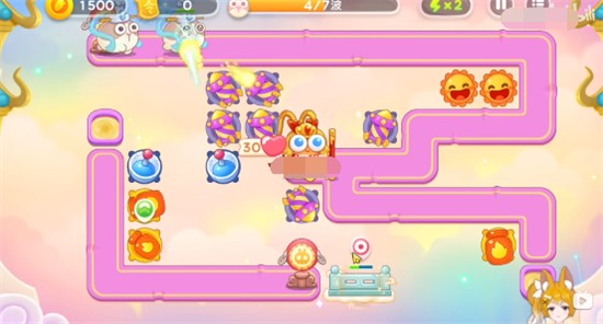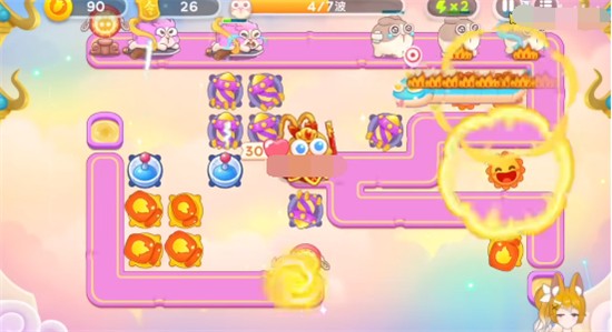 1、开局在右下角放一个三级火瓶,先锁定上方的钱袋打,打掉在右上角位置放满级太阳,火瓶继续清理周围的道具,太阳可以一边打兔子,一边清理道具,在中间可以放一些烟花炮;