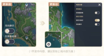 版本更新后,将新增地图-设置界面,旅行者可以在设置中调整地图标识(秘境、牌手、自定义标记)的显示。同时区域的显示界面也将调整为更紧凑的样式。