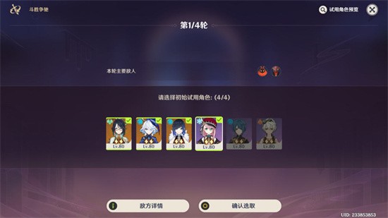 1.每轮选取四名角色,在指定时间内完成挑战