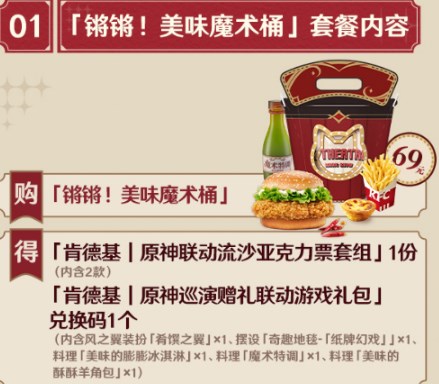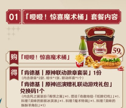 2、购买惊喜魔术桶,即可获得肯德基原神联动徽章套装1份、肯德基原神巡礼赠礼联动游戏礼包兑换码1个。