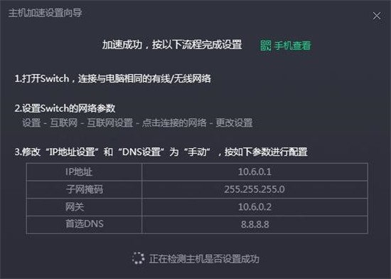 最后开始加速,加速成功会弹出Switch的设置教程,接下来的步骤就转移到Switch上方的网络设置,请根据加速器的提示来进行网络设置哦。