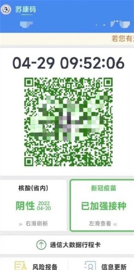 原本江苏苏康码是显示健康码,而在4月29日一早打开支付宝上的苏康码,健康码、核酸结果、疫苗接种信息,一屏展示。核酸检测信息除了显示阴性或阳性信息之外,还能显示最近一次核酸检测的时间;新冠疫苗会显示接种情况。手机屏幕下方仍保留行程卡的小程序入口,可作为行程查询备用。