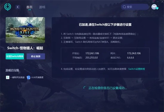 一:在电脑处打开UU加速器,搜索怪物猎人:崛起,打开Swtich-怪物猎人:崛起,点击立即加速