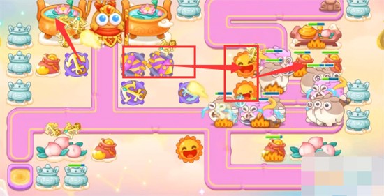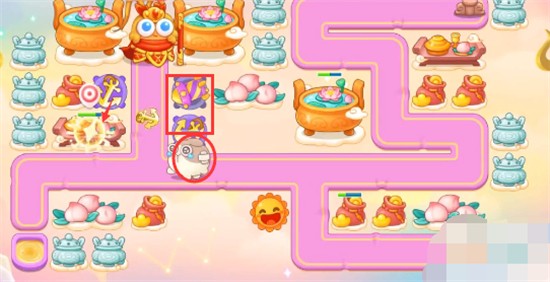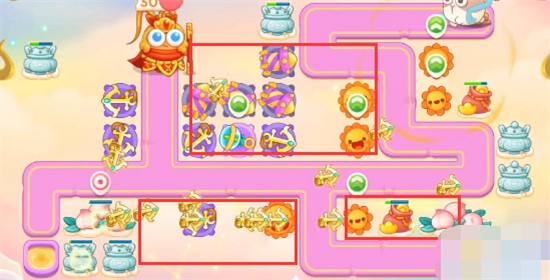 1、本关能够使用的炮塔是:泡泡塔、船锚、太阳、导弹、星星,这一关我们推荐使用船锚+太阳地面输出。