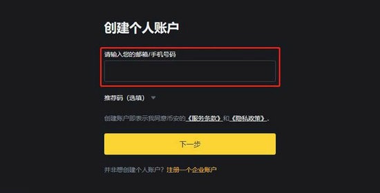 2、币安已全面开放大陆用户进行手机号注册,输入邮箱/手机号、点击下一步即可
