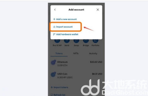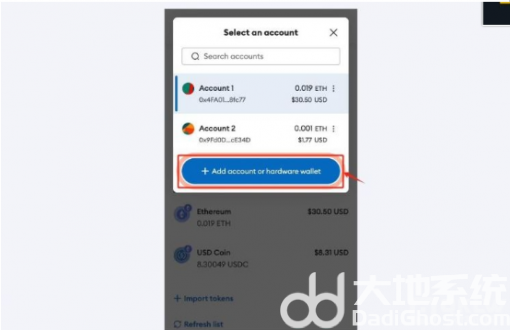 2.页面上就会弹出相应的账户列表,在列表底部有一个添加账户或硬件钱包的按钮,点击这一按钮,页面上就会弹出添加账户的选项。