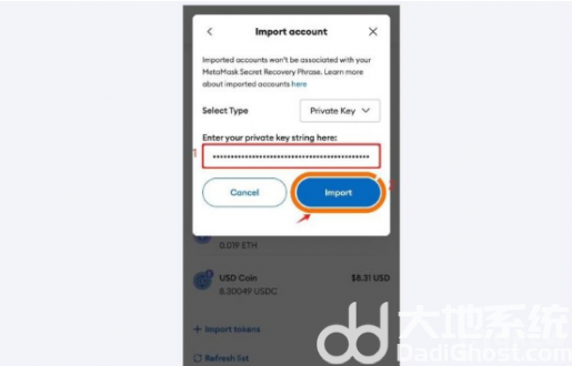 4.用户即可进入导入账户的页面。在导入页面当中粘贴用户的私钥,然后点击页面下方的导入按钮。即可完成私钥的导入。