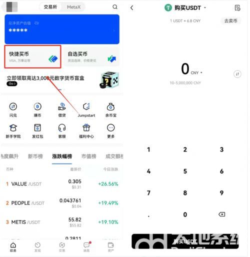第一步:打开欧易APP,在首页点击快捷买币按钮,进入买币页面。