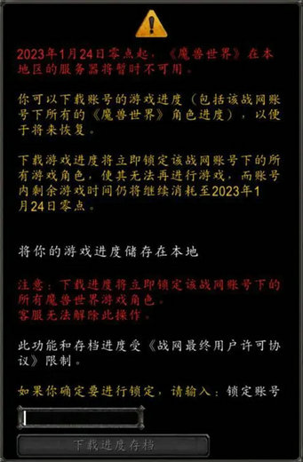 注意,这一保存游戏进度操作是一次性的,下载进度将立即锁定该战网账号下的所有《魔兽世界》游戏角色,客服也无法解除,所以大家要明确近期不再上线后再进行保存。