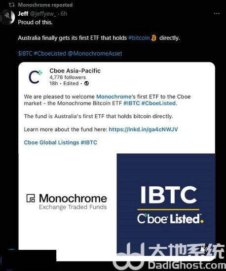 总部位于澳洲的Monochrome Asset Management所推出的比特币现货ETF(IBTC)在6月4日时,正式上线澳洲芝加哥期权交易所(Cboe Australia),实际上澳洲已有两种交易所交易产品(ETP),可在澳洲芝加哥期权交易所提供加密资产现货,但这些ETP并未直接持有比特币。