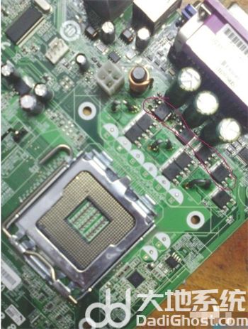 第二步,把主板从机箱里拆了出来,卸下内存和CPU,使用“主板诊断卡”来诊断。把“诊断卡”插在主板扩展槽上给主板通电,“诊断卡”上没有任何反应。决定对主板进行强制上电,在电源主插头上有卡扣的那面有根绿色的线(有的是灰色的),将它与旁边的黑色的线短接起来电源就被启动了。在主板背面找到绿线连接着的那根插针,用镊子把它和旁边的连接黑线的那根插针短接在一起,在电源接通的一瞬间“诊断卡”上的电源指示灯闪了一下,看来是主板某处短路而使电源保护装置动作。