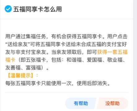 拥有“五福同享卡”的用户,可以选择将“五福同享卡”送给其他当下还没有合成五福的用户哦,当接收的人领取“五福同享卡”后,领取的人可以直接获得一套完整的五福卡(敬业福、爱国福、富强福、和谐福、友善福),双方不管是不是支付宝好友都可以互相赠送和领取哦。