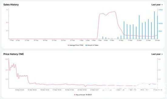 自3.15开始,Notcoin NFT的交易量开始活跃,25日近期最高交易2.5万张,成交均价为10M=6.7TON,成交额为83.75万美元,26日交易2.1万张,成交均价为10M=9.9TON,成交额为103.95万美元。成交最高价出现在3.13日10M=66TON,最低价出现在3.20日 10M=3.7TON。