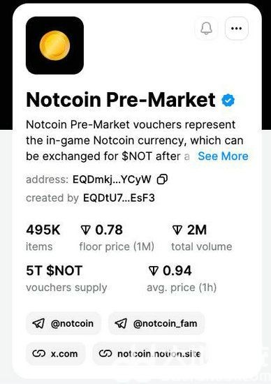 据27日数据,Notcoin NFT约有50万个在流通,当前价值为一张10M=9TON(按5U计算),市值约为2250万美元,总交易量为200万TON,交易额约为1000万。