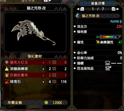 在怪物猎人崛起曙光中大剑武器武器猫之咒怨·改的制作需要猫毛大红玉的素材。