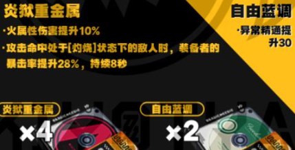 炎狱重金属4件套可以大幅提高11号的火属性伤害,并且在攻击带有灼烧伤害的敌人时可以造成额外的伤害,自由蓝调2件套则可以提供一定的精通加成,提高灼烧伤害。