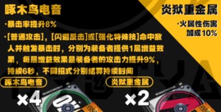 这套配置比火套更适用于11号,啄木鸟提供暴击以及攻击力加成,炎狱则提供火属性伤害加成。