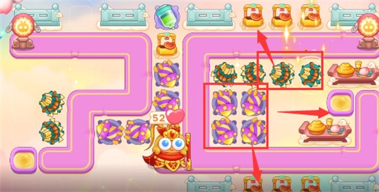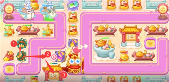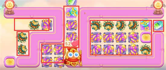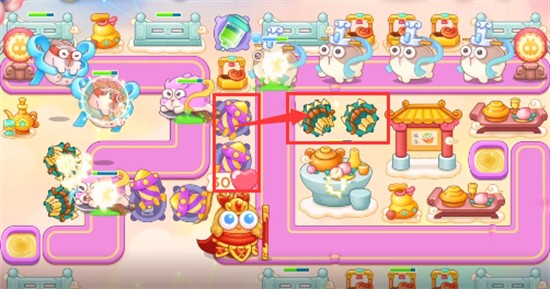 6、具体塔防位置如下,主要输出就是多重箭和烟花,出口地方放置泡泡塔减速。