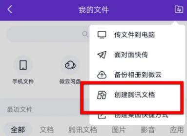 2、点击右上角,选择下拉的“创建腾讯文档”