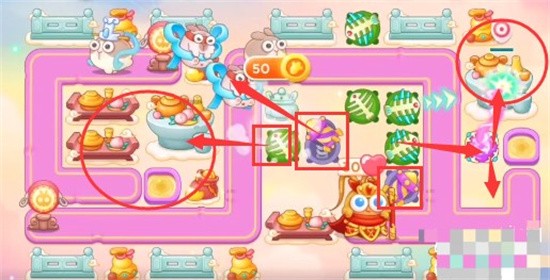 6、最后放置炮塔如图,在萝卜附近全部放置烟花防空,外侧放置魔法球和鱼刺的双输出,毒针打减速和持续伤害。