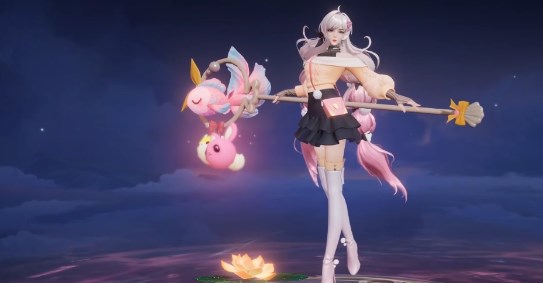 发型设计上,粉色系渐变长发上别着粉色爱心发箍,时尚可爱;服装设计上,米白色简洁上衣,搭配俏皮黑色短裙;配饰设计上,粉色斜挎小包、神秘手杖、可爱小兔子玩偶等元素,使整个角色形象更加甜美和梦幻;武器创意方面化为精美的手杖,手杖顶部装饰类似鱼形设计,上面挂着两只可爱的玩偶,手杖周身闪耀着高贵且梦幻的光泽~