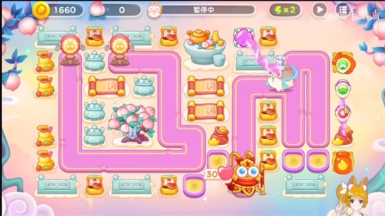 1、今天整体不难,但是无伤比较困难,开局直接进入游戏暂停,然后在中间的位置造一个三级的鱼骨,锁定中间的钱袋,左上角造一个一级的风扇,钱袋掉了之后。
