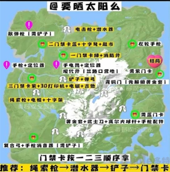 门禁卡按一二三顺序拿,推荐:绳索枪、潜水器、铲子、门禁卡。