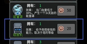 4、取款机:通过摆放炮台可以去偷取金币,获得去取款机即可偷取金币,从而达到升级效果,在商店中购买取款机