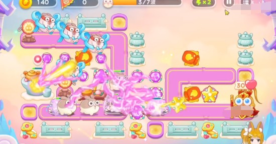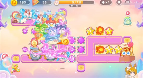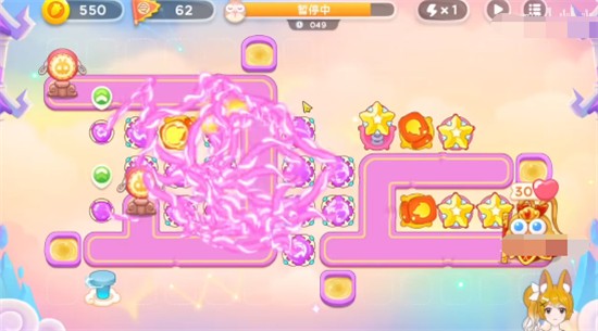 3、第三波的飞飞兔会有很多,玩家要多放星星塔,可以所有打一下,左侧的兔子也不要漏掉,然后可以抽空把道具都给清理完,今天第三波清完有点难,还是要多注意不要漏兔子;