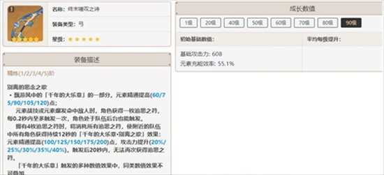 这把武器可以给珐露珊提供超高的元素充能,并且给全队加攻击以及元素精通的效果,这把武器是作为弓箭角色辅助武器的第一选择。