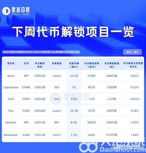 一周代币最新情况是什么呢,在本周的代币中有5 个项目将迎来代币解锁事件。包括 Aptos 、 CyberConnect 、 1inch 、 Flow 、 ApeCoin 、MoonBeam 等。接下里小编为你们带来详细的一周代币情况介绍。