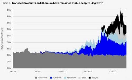 重心明显转向特定领域区块链平台和模块化区块链架构。尽管以太坊的L2扩展解决方案有所增长,但主网仍然是主要的活动中心。