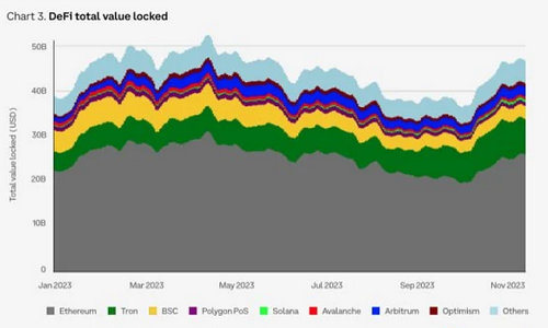 以太坊继续在智能合约平台中处于领先地位,占据相当大一部分市场。DeFi总锁定价值中约有57%的TVL在以太坊网络上。