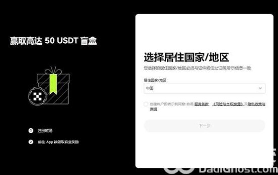 3、选择居住国家/地区,勾选服务条款、《风险与合规披露》及隐私政策与声明