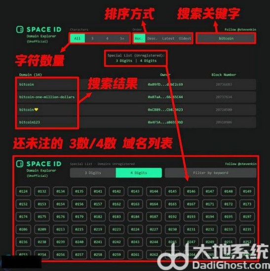 1. 选择域名利用 Space ID Domain Explorer 可以找出所有还未注册的3位数字& 4位数字域名,也支持关键词搜索。
