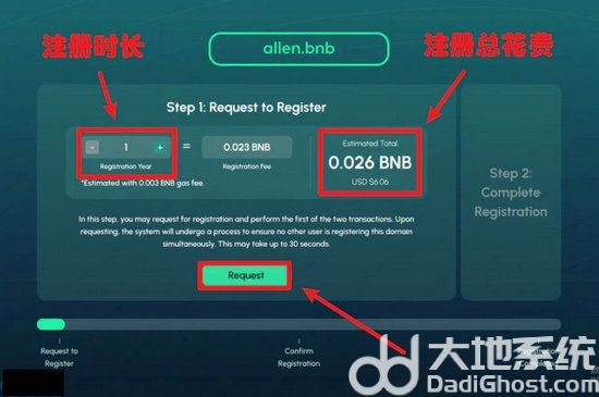 注册一个域名一共要确认两笔链上交易,第一次是 “请求(Request)”,第二次是 “注册(Register)”。输入注册的时长,检查注册总花费,确定没问题后点击【Request】,小狐狸弹窗跳出后点击确认交易。