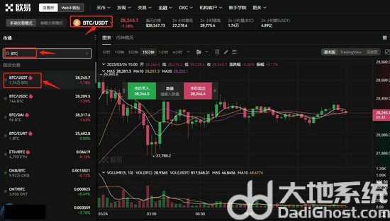 5、在搜索框输入BTC,选择BTC/USDT交易对,就能看到实时比特币BTC行情
