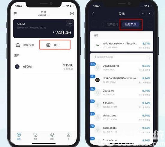 1、打开Cosmos钱包点击「委托」,点击「验证节点」即可查看各验证节点的预计年化收益和已被委托的ATOM数量。