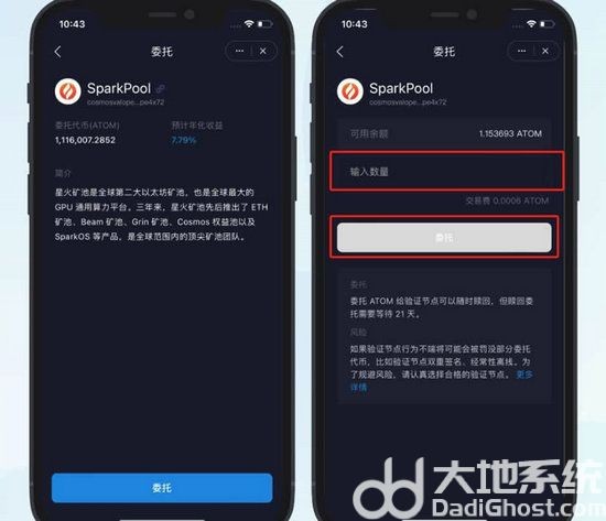 2、点击「委托」按钮进入委托页面,输入委托的ATOM数量,点击「委托」并确认就完成了一次委托。