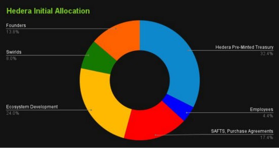 HBAR 的最大供应量上限为500 亿个代币。发行时,所有代币均已分发,并遵守15 年的兑现时间表。其中,23.9%分配给生态系统和开源开发,22.26%分配给购买协议(早期投资者),14.77%分配给网路治理和运营,7.74%分配给初始开发成本和许可。这还剩下31.33% 的未分配资金,将根据Hedera 理事会的投票使用。