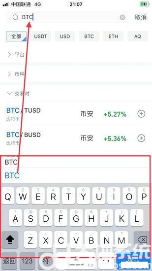 输入我们要搜索的币种名称,如比特币/BTC