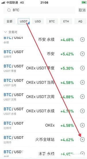 找到BTC/USDT这个交易对,在它的后边有个+号,这是添加到自选的按钮,点一下,它就被添加到你的自选当中